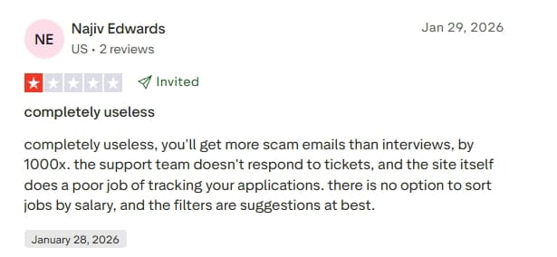Trustpilot currently shows a substantial volume of reviews and a broadly positive average rating, but with meaningful criticism included in recent posts. The negatives highlighted in the preview include claims like “completely useless”, increased scam emails, nonresponsive support, and weak tracking. The positives include reports of time savings and even landing jobs.