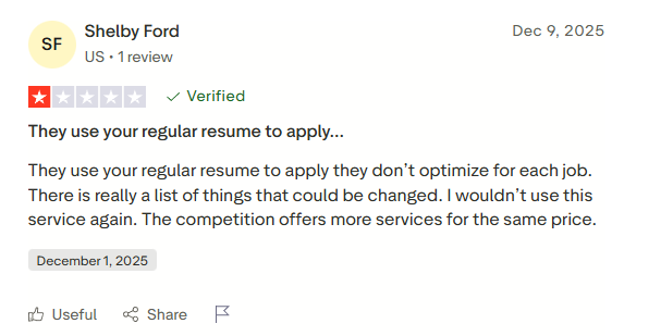 User Shelby Ford left a 1-star review of Sonara.ai, criticizing it for using the same resume for all applications and saying she wouldn’t use it again, as competitors offer more features.