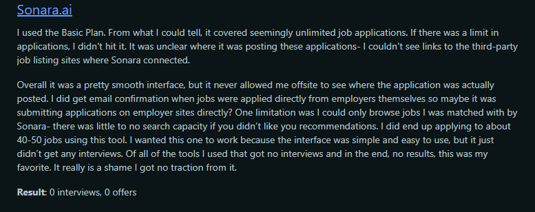 The user found Sonara.ai’s interface friendly but got zero interviews after 40–50 applications, citing lack of transparency and limited search options.