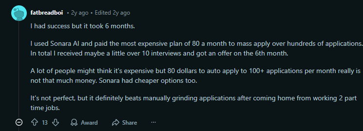 User fatbreadboi used Sonara AI for six months, automated hundreds of applications, got 10+ interviews, and landed a job, finding it worth the cost.